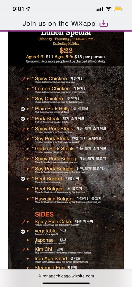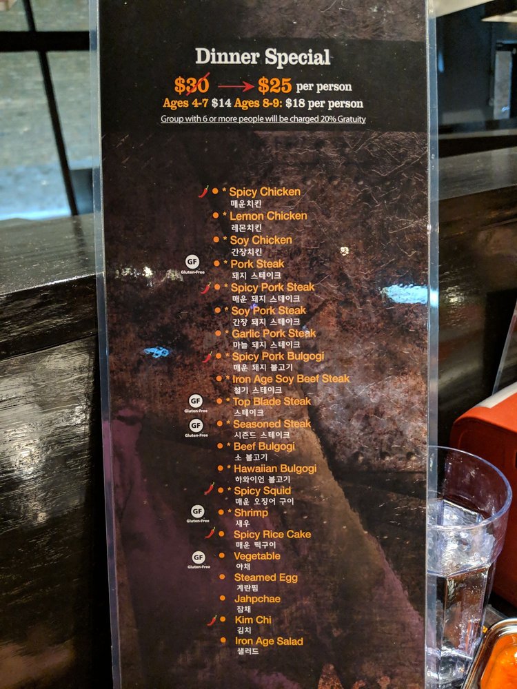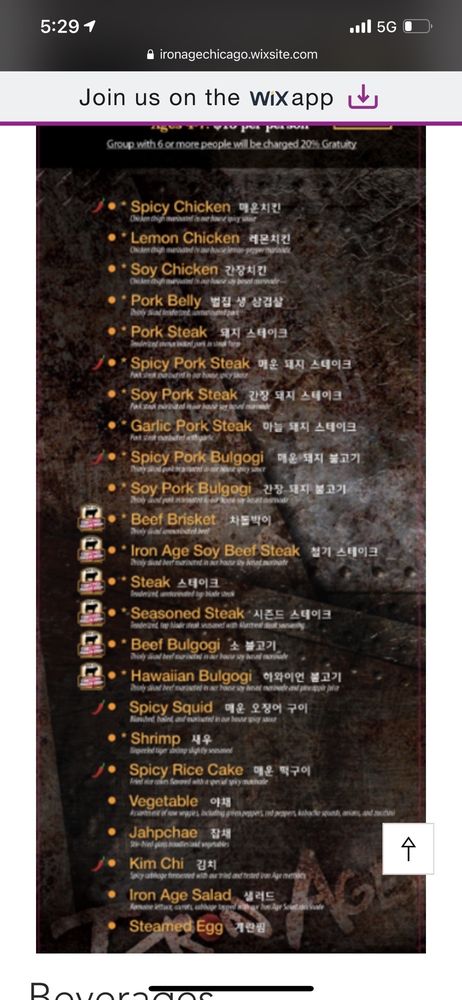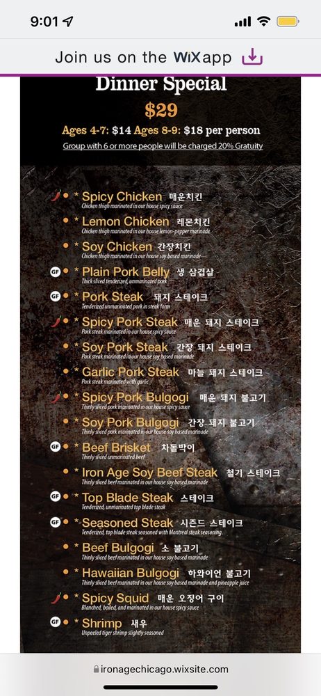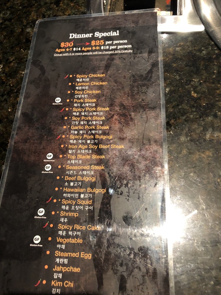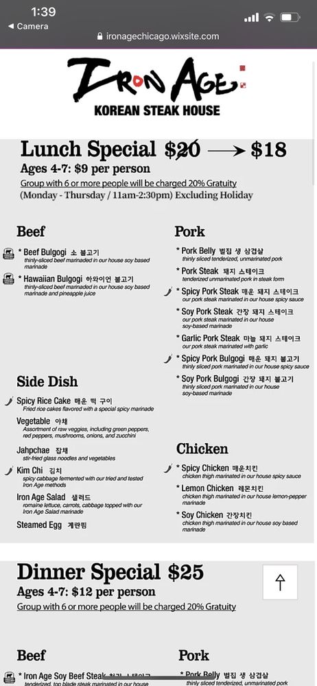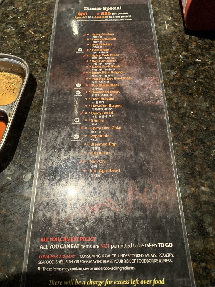 Iron Age Korean Steakhouse is a trendy, casual restaurant located in Chicago, IL, offering a unique all-you-can-eat Korean BBQ experience. Known for its fast service, extensive menu options, and delicious food, Iron Age is a must-visit for KBBQ lovers. The restaurant provides a cozy atmosphere with booths for seating and is perfect for group gatherings or a late-night meal. With a full bar, TV, happy hour specials, and outdoor seating, Iron Age caters to a diverse crowd. Customers rave about the quality of the meat, flavorful side dishes like japchae and zucchini, and the overall enjoyable dining experience. Don't miss out on trying SOJU, a popular Korean alcoholic beverage, while indulging in the mouthwatering offerings at Iron Age Korean Steakhouse.